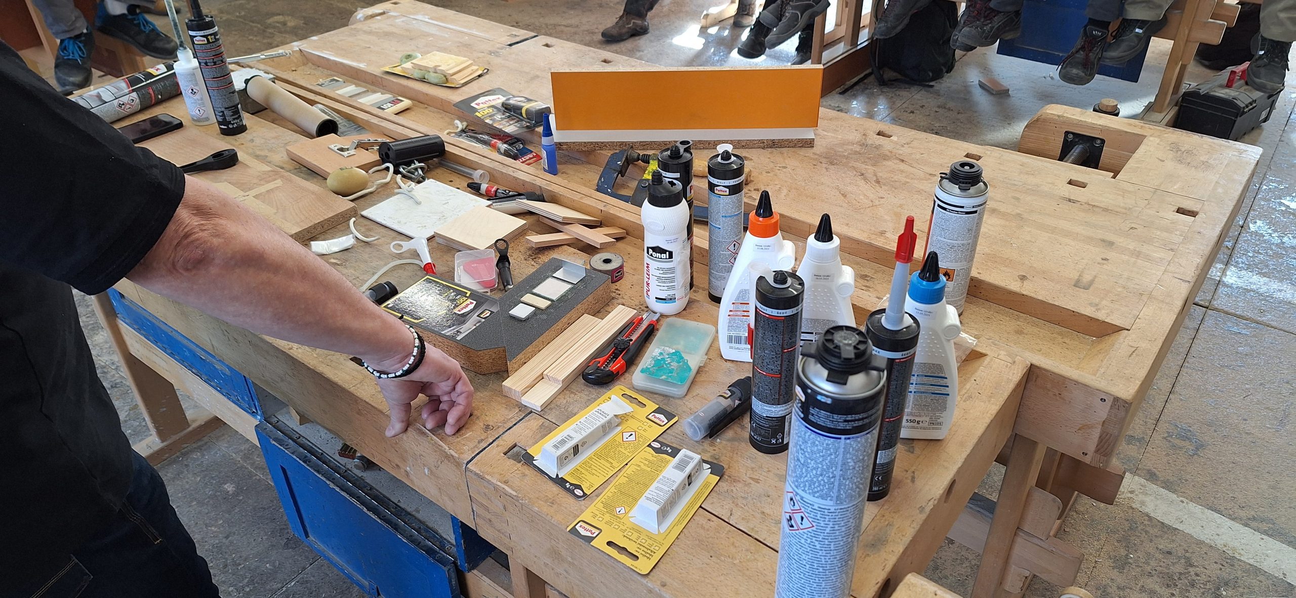 My, truhláři, jsme dnes měli možnost nahlédnout detailněji do „alchymie“ lepení dřeva díky odborníkovi největšího světového výrobce lepidel HENKEL. Pan Fríbert si pro naše druháky a třeťáky připravil zajímavé představení lepidel a tmelů na dřevo i další materiály používané v truhlářské výrobě. Nechyběla ani cenná možnost některé produkty prakticky vyzkoušet na připravených vzorcích dřeva.